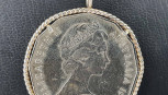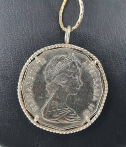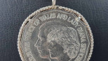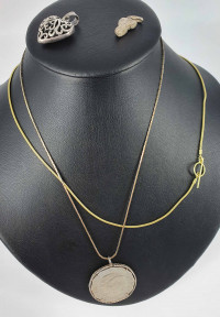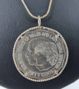 one chain gilt silver; with 1981 commemorative 50 cent coin and silver pendant; HEART PENDANT. Together with a silve boot charm. (5) -