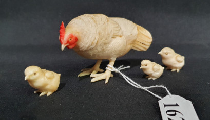 of a hen and three chicks, polychrome decorated. Height: 5cm - 1cm. (4) -