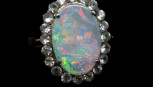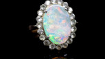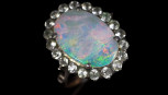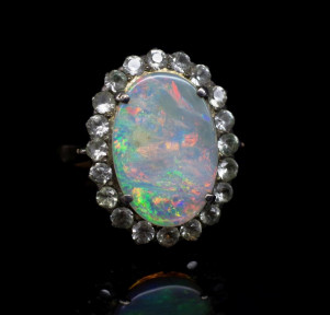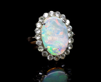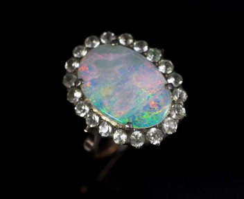 set with old cut colourless gemstones ( tests as white sapphires), in a silver setting. Unmarked. Approx opal size 15.4x 10.4x1mm, ring size N, item weight 4.4 grams. -
