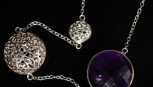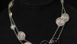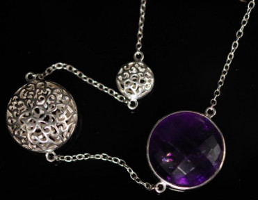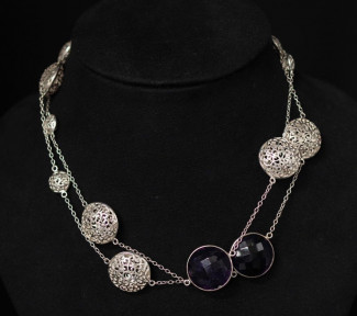 marked 925 KJ. Approx checkerboard amethyst cut dia. 19mm, item length 84cm, total weight 45 grams -