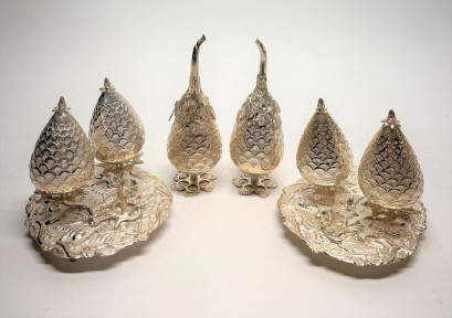 Lot Description:Two Matching Silver (800) Cruet Sets with Ornate Acorn Detail