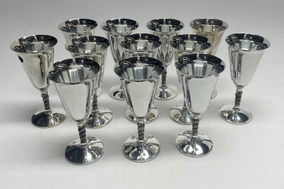 Lot Description:Twelve Silver Plate Wine Goblets with Twisted Vine Stem Detail