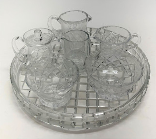 Lot Description:A Collection of Cut Crystal & Glass Table Ware including Creamers, Sugar Bowls & Serving Tray with Diamond Detail