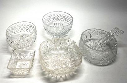 Lot Description:A Collection of Cut Crystal & Glass Serving Bowls including one with Matching Salad Servers