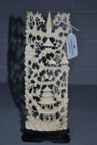 Lot Description:Well carved pierced ivory section cascading figures & pagodas