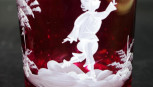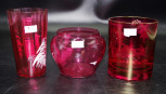 each of ruby glass, including: sugar bowl, and 2 various beakers, with traditional applied figural decoration, (height 11cm approx each beaker). -