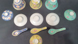 each yellow, turquoise and dark blue, with spoon, and stand, red printed mark to base. Diam: 10 cm. (3 items) -