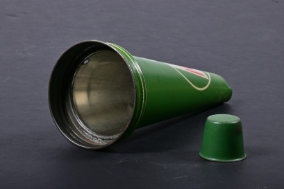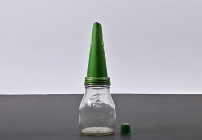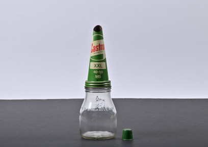 Lot Description:CASTROL WAKEFIELD: An one pint glass oil bottle with a NOS XXL 40-50 MS Castrol Wakefield motor oil tin pourer