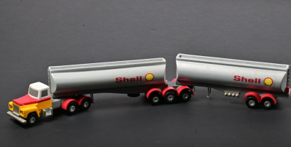 Lot Description:SHELL: A wooden model of a B-Double oil tanker