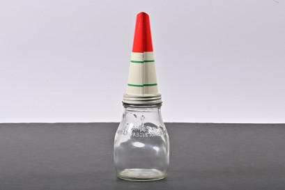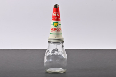 Lot Description:BP: A one pint glass oil bottle with NOS BP Energol SAE 20 HD tin oil pourer