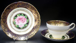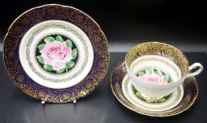 painted rose trio, cobalt blue and gilt decoration, double warrant mark. Circa 1940s. -