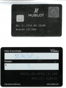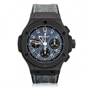 Dial: blue denim dial, baton indexes, skeletonised hands, subsidiary dials for constant seconds, 30-minute and 12-hour registers, aperture for date; Calibre: cal. HUB4104 automatic winding movement, 27 jewels; Case: black ceramic case and bezel secured by six black titanium screws, crystal display back secured by six screws; Case number: 849048; Closure: black Hublot rubber strap with blue denim inlay and black PVD steel Hublot folding clasp; Dimensions: 44mm diameter, bracelet circumference approximately 180mm; Signed: case, dial, and movement; Accessories: Hublot warranty, presentation box and outer box -
