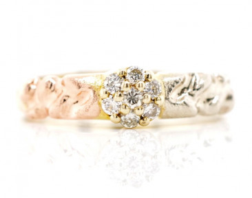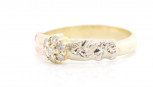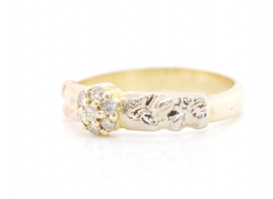 with a yellow gold body and rose & white gold shoulders, marked 585. Approx weight 2.84 grams, ring size O, setting size 5.3mm -