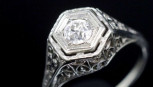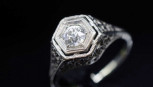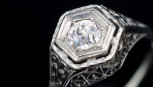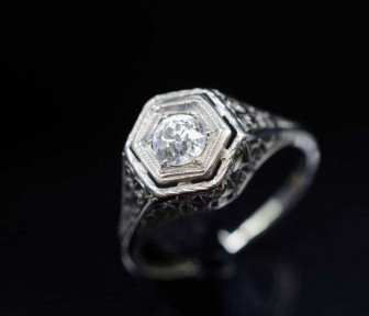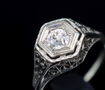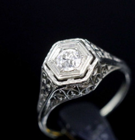 with fret work shoulders an trellis and a later sympathetic white gold shank marked 18k. Approx Old mine cut diamond = 0.39ct estimated, setting size 8mm hexagonal, ring size L, tests as 15ct, -