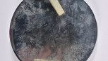 enamel on red background, chrome surround, twin screws; measures 9.5 cm in diameter. -