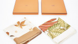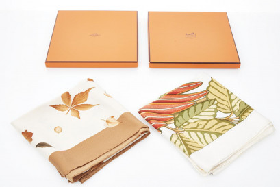 white, green, red detail of parrots, hand rolled hem, signed within the print ‘Hermes Paris’, labelled ‘Made in France 100% silk', together with brown hues depicting autumn leaves, labelled 'Salvatore Ferragamo Made in Italy 100% silk', with box (2) (A/F)