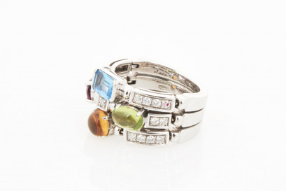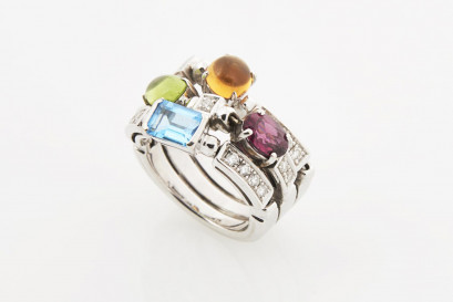 18ct white gold contemporary diamond and coloured stone ring, designed with three articulated bands, claw set with citrine, topaz and peridot, in the style of Bvlgari Allegra collection, stamped '750'
