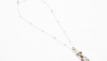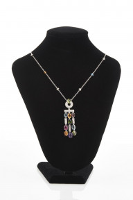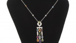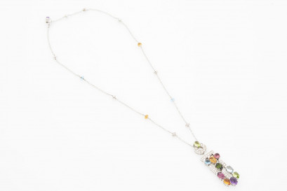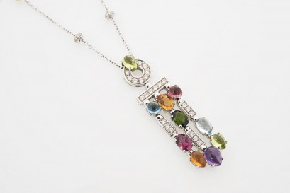 18ct white gold geometric pendant with articulated links, embellished with diamonds, amethyst, citrine, tourmaline, attached to fine trace chain, stamped '750'