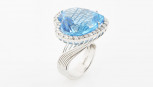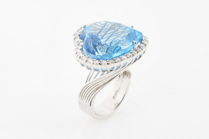 featuring large blue topaz set in 18ct white gold, claw set with border of round brilliant cut diamonds, elevated with interwoven open framework, stamped '750'