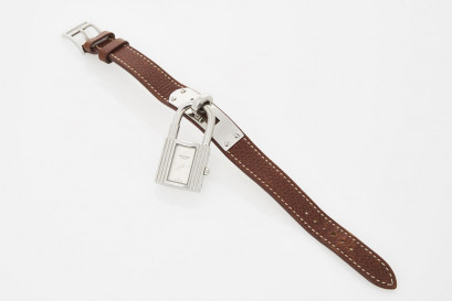 Ref KE1210, quartz movement, silver dial, silver hands in the form of a padlock on a stainless steel rivet plaque on a camel coloured leather Hermes band, serial number 1750610, light scratches to case