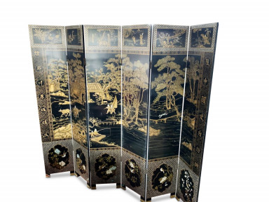 Lot Description:Beautiful Chinese Six Panel Black Lacquer and Gilt Folding Screen