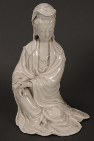 of Guanyin, depicted seated with serene expression on face and holding a scroll in left hand, incised stamps verso, height 23cm -