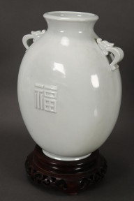 of baluster form, set with raised characters to each side and flanked by a pair of dragon loop handles, in a soft white glaze, raised on an oval foot with impressed Qianlong mark on base, with stand, height 31cm -