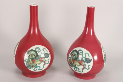 of bottle form, decorated with roundels of kylin on a pink ground, six character mark within double rings to base, height 42cm (2) -