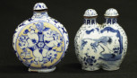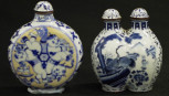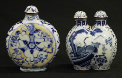 each with blue and white enamel decoration, including double snuff bottle, and moon shaped snuff bottle, character marks to bases, (height 7.5cm approx, taller bottle). -