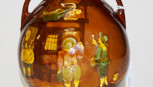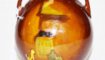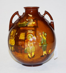 figural decoration to face of Drinkers at a Tavern, and reverse a dog figure, dual handles, marked to base, (height 15cm approx). -