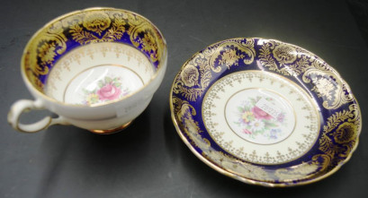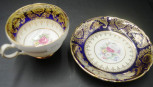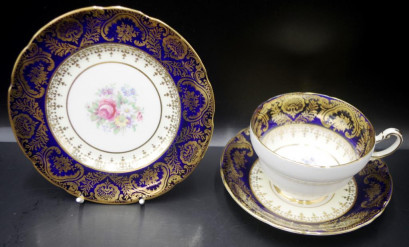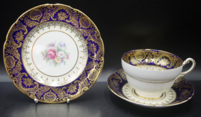painted blossom decoration, cobalt blue and gilt borders, circa 1940s. -