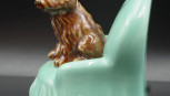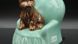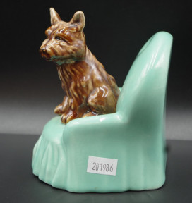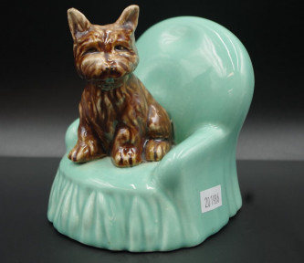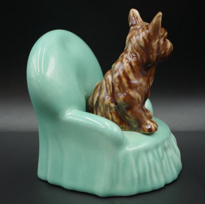 depicting a brown Terrier Dog seated on a green upholstered armchair, marked to base, (height 12cm approx). -