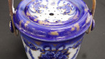 large ceramic wash bucket, caned handle, marked to base, 'flow blue' decoration, with fitted internal bowl and strainer, (height 26cm; diameter 32cm approx0. -