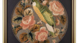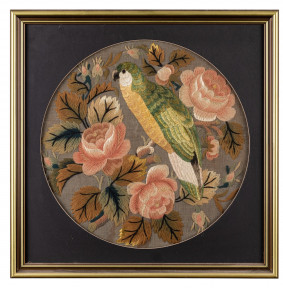 Lot Description:A woolwork and silk picture of a parrot perched on a flowering branch