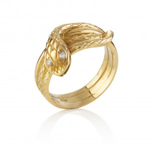 Lot Description:An 18ct yellow gold snake ring with diamond set eyes