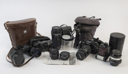 with Nikkor AF 35-153mm f3.5-4.5 telephoto lens; AF Teleconverter TC-16A; Nikkor-S.C. Auto 50mm f1.4 lens; AF Nikkor 70-210mm f4 telephoto lens; 28mm AF Nikkor f2.8 lens; Nikon Speedlight SB-20; a pair of Nikon J-B7 binoculars with case, etc. -