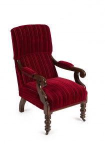 with scrolling arms and raised on turned legs, upholstered in striped ruby velvet -