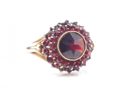 Lot Description:Garnet set 14ct yellow gold cluster ring