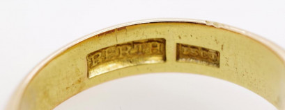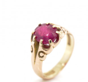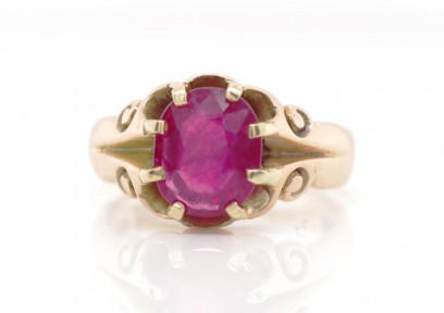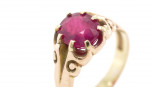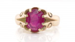 treated ruby. Marked Levinson 15ct Perth. Approx ruby size 8.6 x 7.1 x 4.4mm, ring size L, ring weight 5.8 grams, tests as 16-17ct -