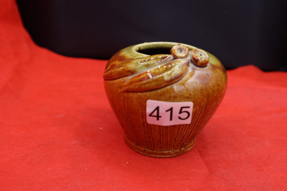 Lot #415 - Remued brown, green pottery vase with attached gumnuts & leaf