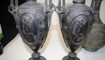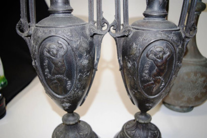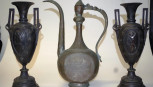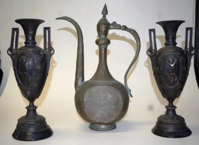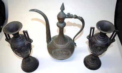 each with embossed decoration, on footed marble bases, (height 32cm approx, each); together with a Turkish decorative metal coffee pot, (height 40cm approx). -