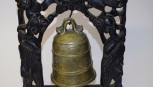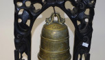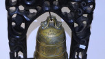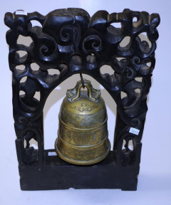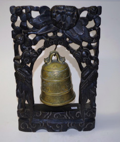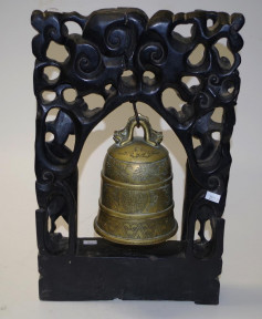 Lot Description:Chinese brass bell in a carved timber stand