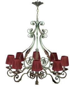 with profuse scroll work throughout and tole embellishments, the main branches supporting electric candles and maroon gathered fabric shades
