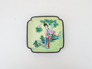 Small square Canton enamel metal export dish. 9.5 cm (d). -