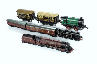 Dublo includes M7 tank engine and Duchess of Atholl, and 2 LMS coaches. O Gauge includes M1 clockwork engine and 2 Pullman coaches. Overall condition fair only. L14cm (6C) -