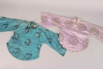 one in blue satin with foliate motifs, length 51cm, the other in lavender satin decorated with scalloped sleeves and waist and shou symbols, length 48cm (2) -
