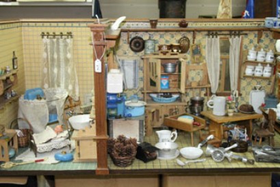 Two room display for a doll's miniature kitchen and bathroom. Containing a large quantity of miniature kitchenalia and doll's house furniture. H.390mm. W.920mm. D.425mm.