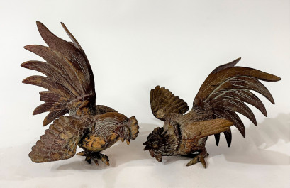 Lot #8123 - Two Chinese Iron Cold Painted Figures of Cockrill's with Red & Gilt Detail