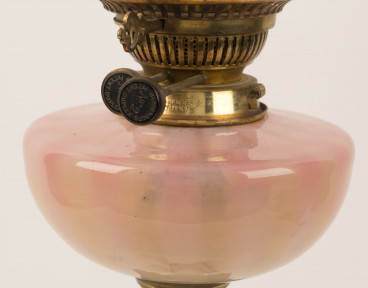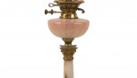 onyx and gilt metal column base, pink glass font, black button double burner with bayonet mount and acid etched shade,