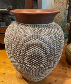 Lot Description:A Traditional Lombok, Indonesia Large Clay Floor Vase with Ratan Detail